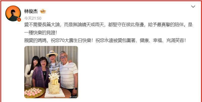 看文字和内容,可以看出林俊杰是在为母亲过生日,但因为晒出的照片不同寻常,网友看出林俊杰是借母亲生日官宣了恋情的消息。在文案中,林俊杰写道:亲爱的妈妈,祝您 70 大寿生日快乐!祝您永远被爱包围着、健康、幸福、充满笑容!此外,他还写道“爱不需要长篇大论,而是无论晴天或雨天,都坚守在彼此身边,给予最真挚的陪伴。是一种快乐的见证。”